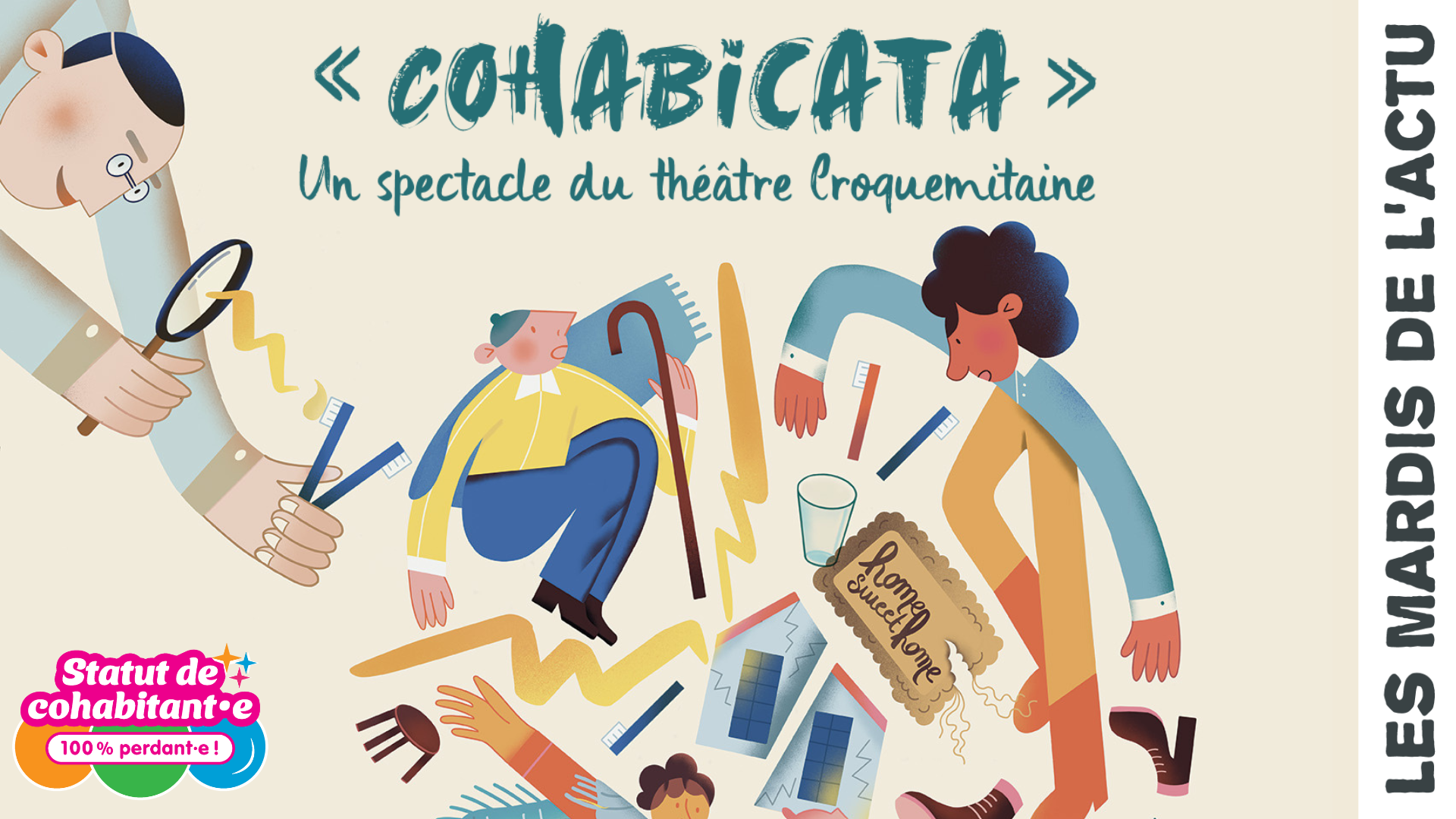 Sur un ton léger, mais avec un regard acéré, le Théâtre Croquemitaine nous expose les situations ineptes engendrées par le statut de cohabitant·e. « Cohabicata » est un spectacle rigoureusement comique et instructif qui propose aux spectateurs et spectatrices de comprendre en un instant l’essentiel des enjeux autour de la suppression du statut de cohabitant·e.
