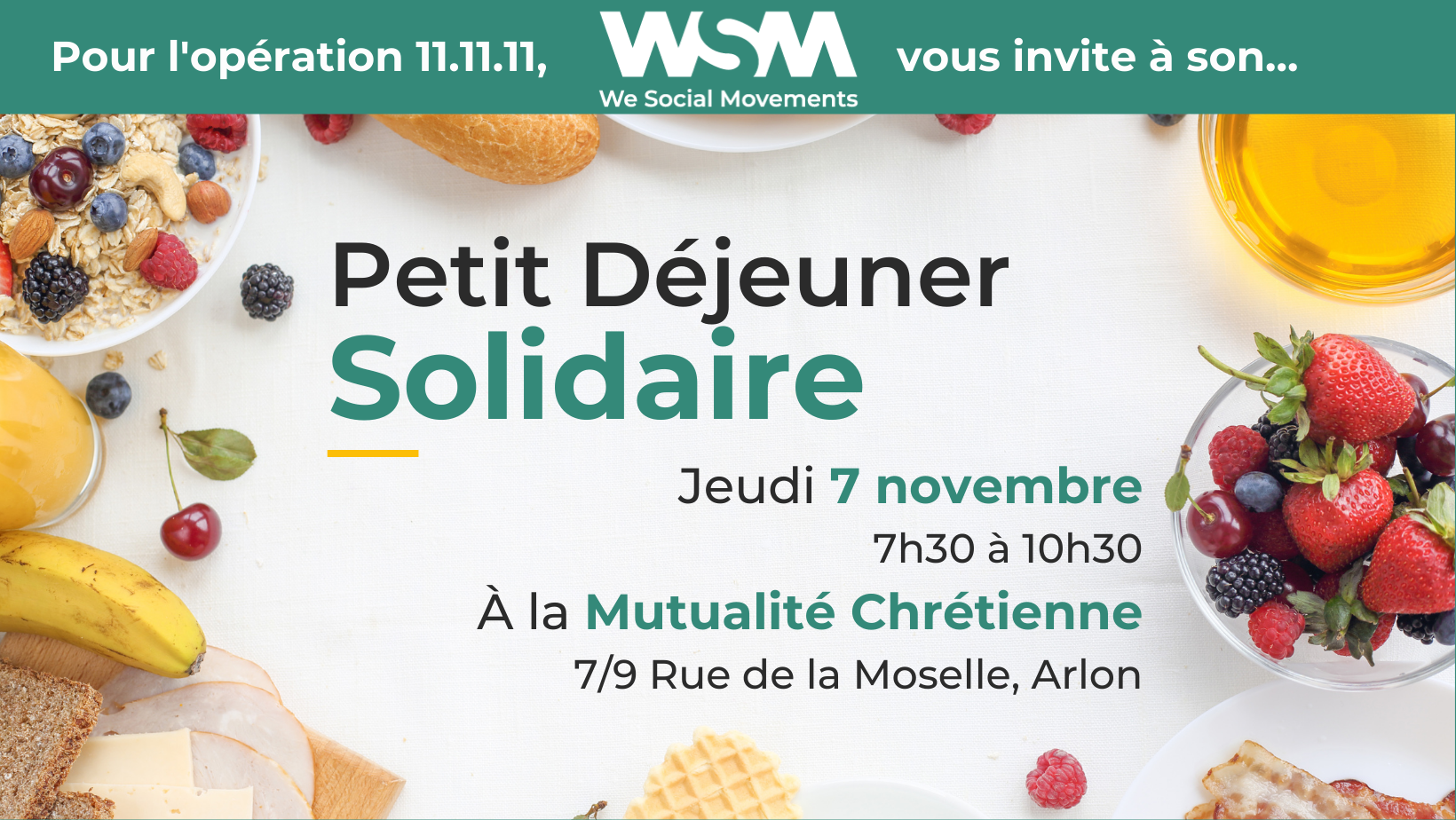 Nous vous convions à nouveau cette année au petit déjeuner solidaire organisé dans le cadre de la campagne 11.11.11 dont les profits soutiendront l’action de WSM, l’Organisation Non Gouvernementale du MOC.